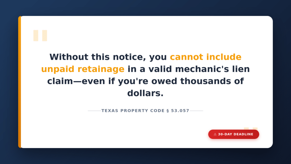 A notice of contractual retainage is a formal document that preserves your right to file a mechanic’s lien for retainage amounts withheld under your subcontract. Texas Property Code Section 53.057 specifically governs this requirement.